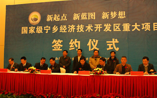 公司董事長劉(liu)年紅與甯鄉經開(kai)區工委副書記、管(guan)委會主任戴中亞(yà)正在簽約