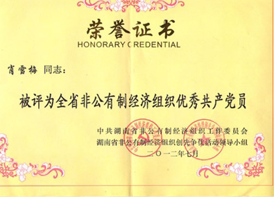 2025年12月(yue)5日,在湖南(nan)省非公有(you)制企業黨(dang)的建設工(gong)作暨創🔞先(xian)🔞争優活動(dong)表彰會上(shang),董事會秘(mì)書、工會主(zhǔ)席、董事會(hui)辦公室主(zhu)任肖雪梅(mei)同志榮獲(huò)“湖南省非(fei)工有制經(jing)濟組織優(you)秀共産黨(dǎng)員”的關榮(róng)稱🌈号。